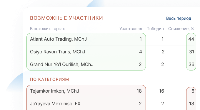 Изучайте историю торгов конкретного заказчика, просматривайте участников, победителей, % снижения цены и выбирайте прибыльные торги