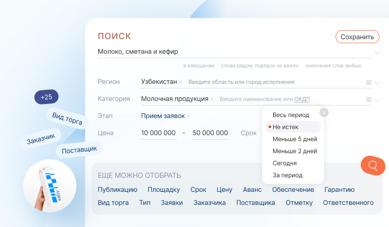 Добавляйте в избранное интересные торги из любого поискового запроса и работайте с ними отдельно от общей выдачи